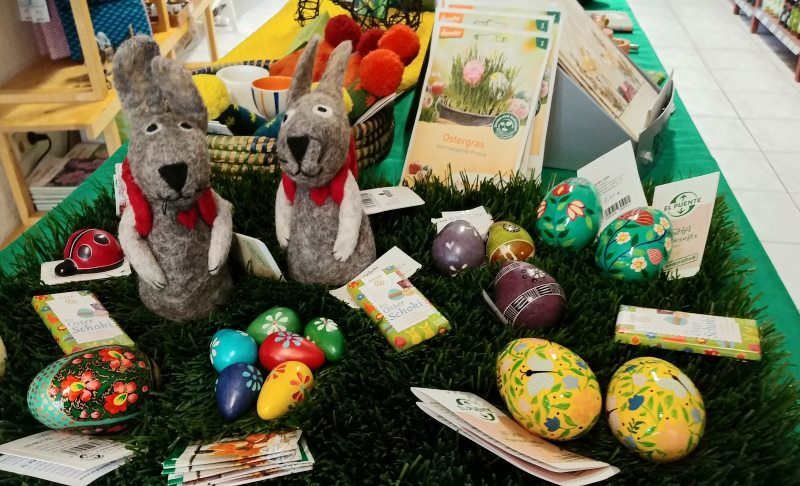 der Frühling und damit auch das Osterfest stehen vor der Tür und auch in diesem Jahr bieten wir wieder eine Reihe leckerer Oster-Schokoladenprodukte aus 100% fair gehandelter Schokolade an! Neben Schokohasen, Ostereiern und anderen Süßigkeiten finden Sie bei uns auch eine Vielzahl fair gehandelter Kunsthandwerksprodukte, die sich als kleine Geschenke oder Dekoration rund um das Osterfest eignen.